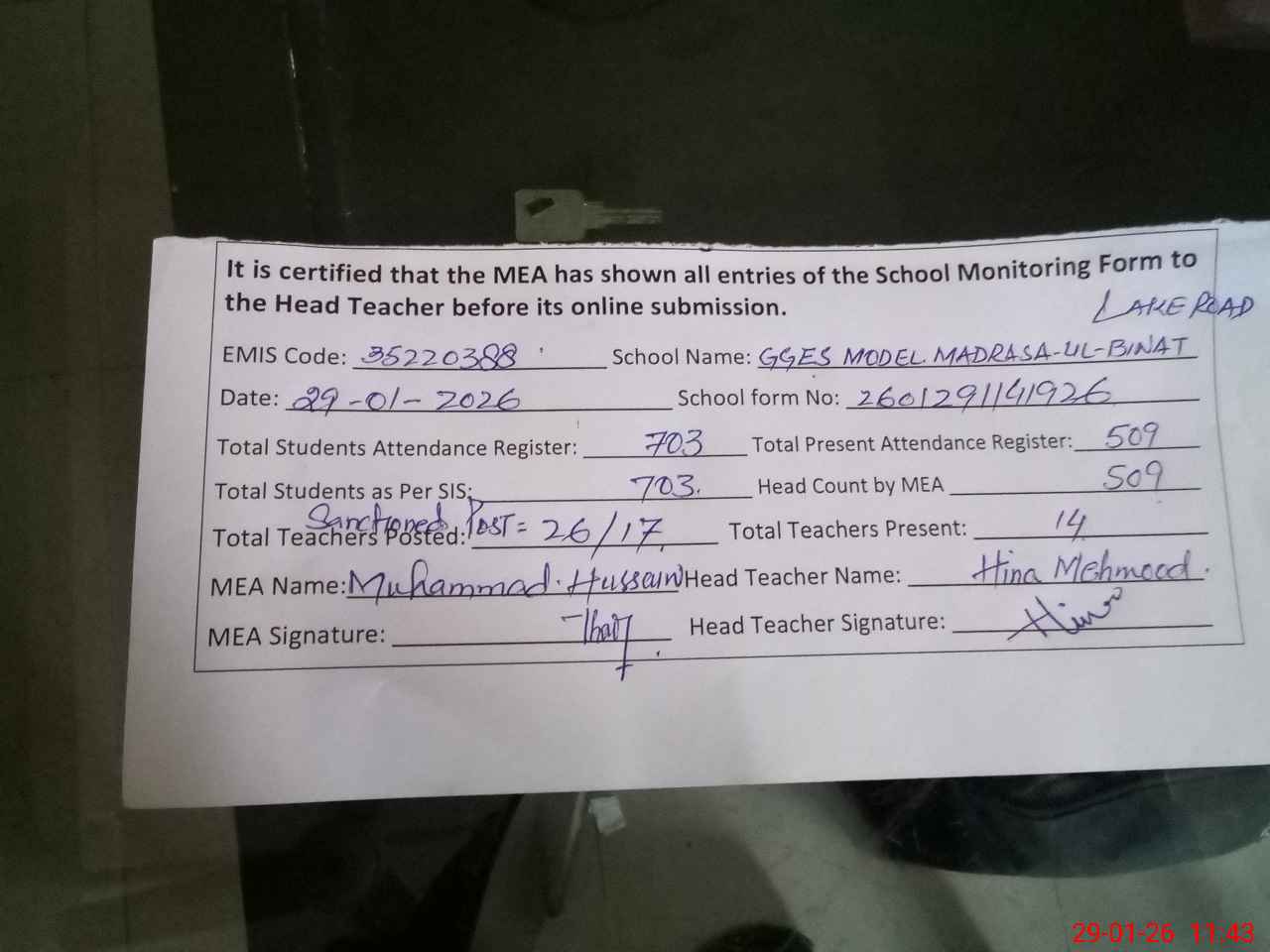 | EMIS Code: 35220388 | Name of School: GGES MODEL MADRASSA-TUL-BANAT LAKE ROAD | |||