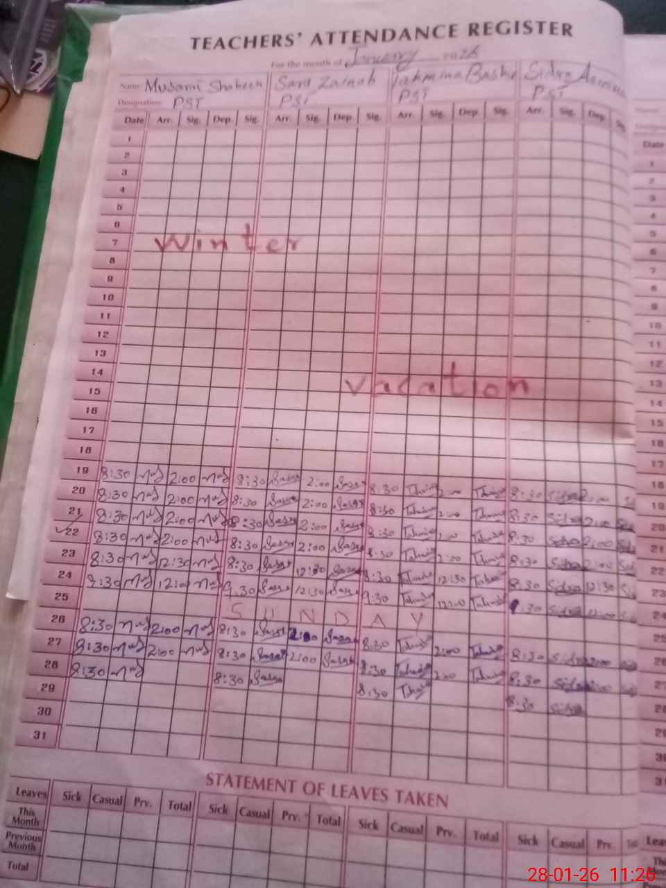 | Leave | Duty | Absent | Maternity | Medical | Ex- Pak |