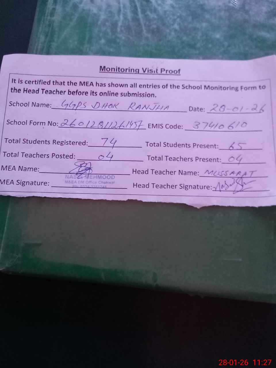 | Attendance Register | Head Teacher | MEA with School | Visit Proof |