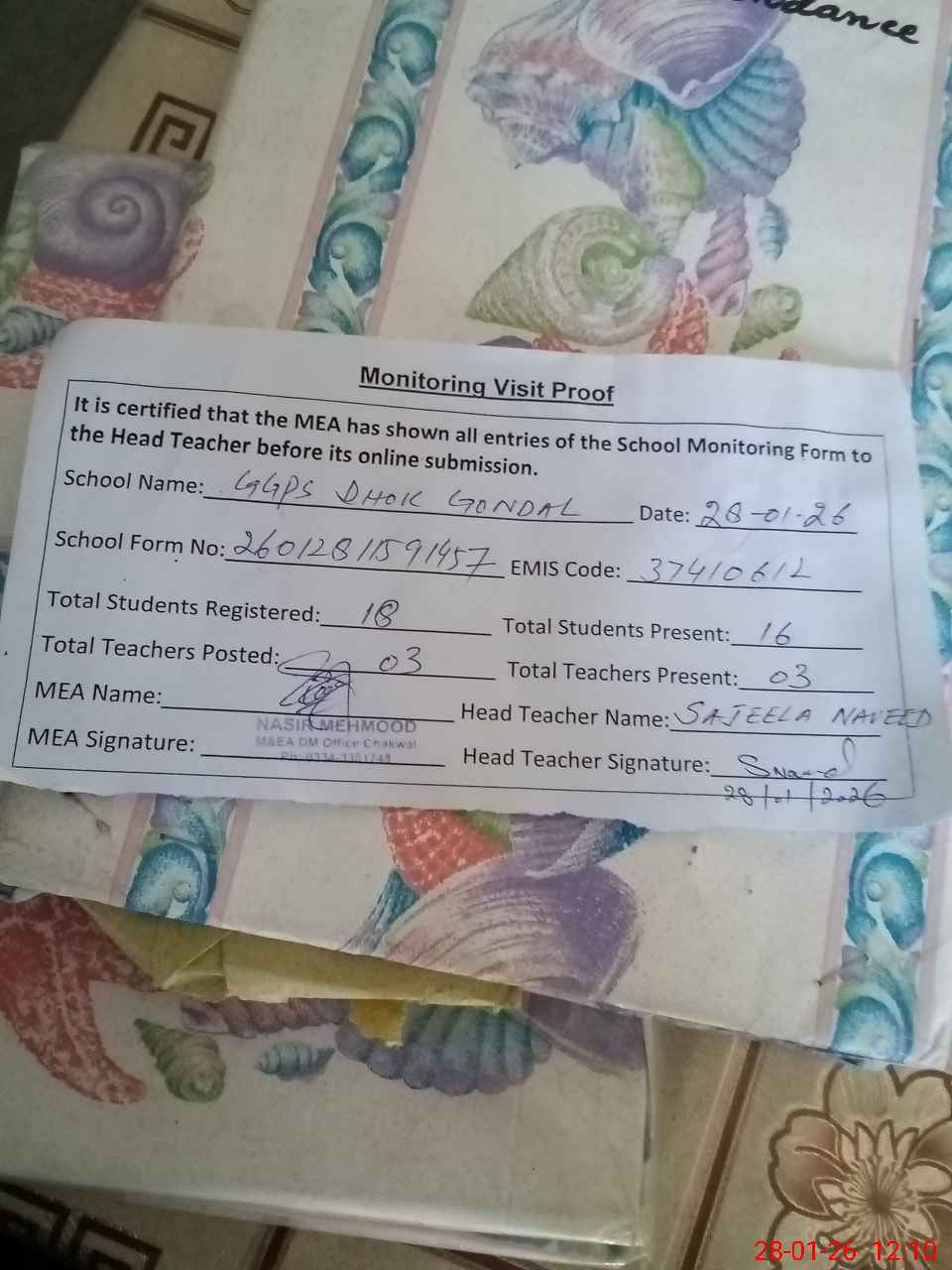 | EMIS Code: 37410612 | Name of School: GGPS DHOK GONDAL P/O DULLAH | |||