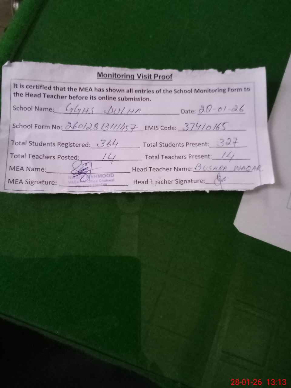 | Certified that this School was Inspected by the Undersigned MEA/DMO Today and the Information Stated Above is as Per Record. | |||||