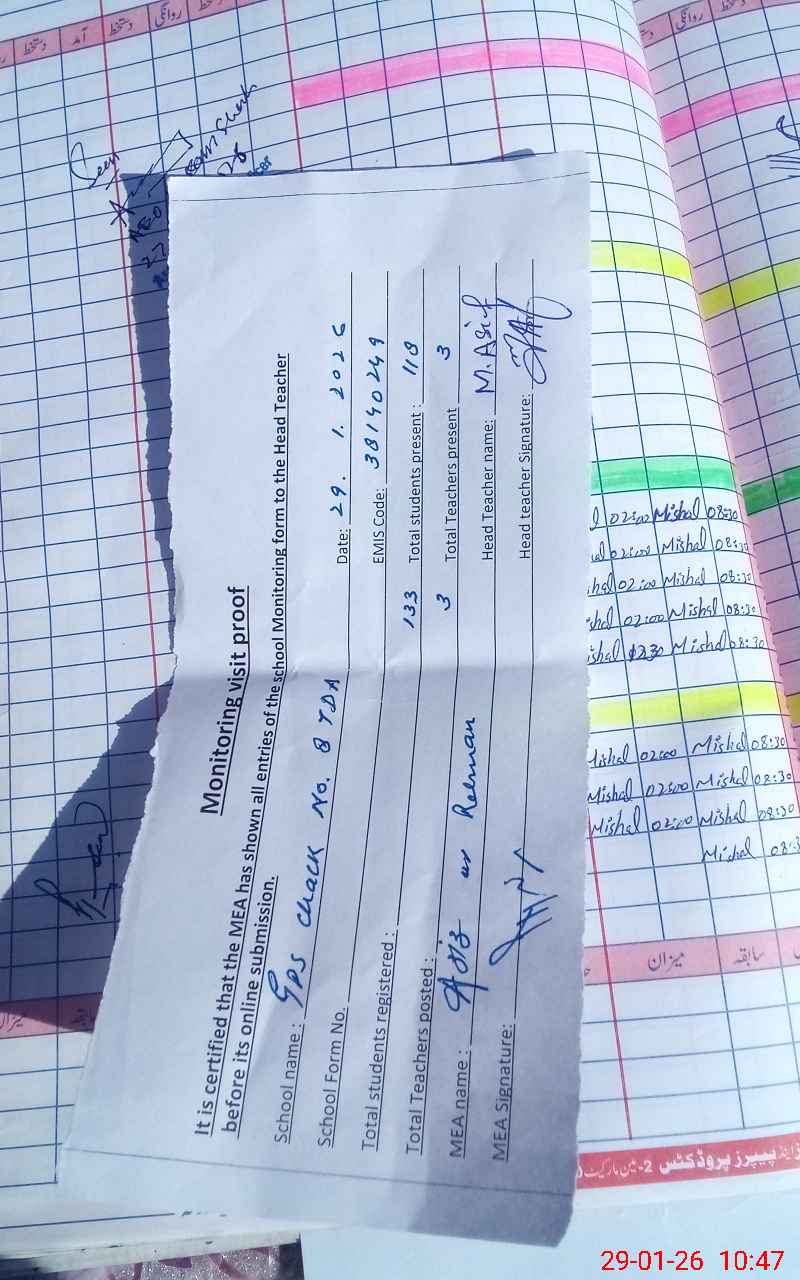 | EMIS Code: 38140249 | Name of School: GPS CHAK NO 8 TDA | |||