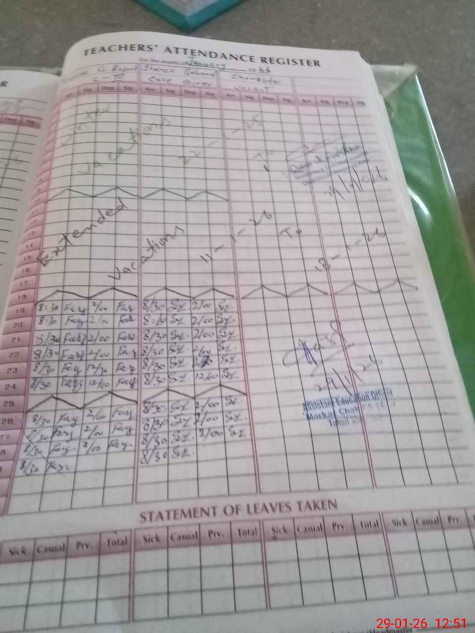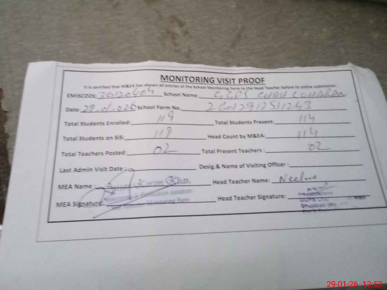 | Attendance Register | Head Teacher | MEA with School | Visit Proof |