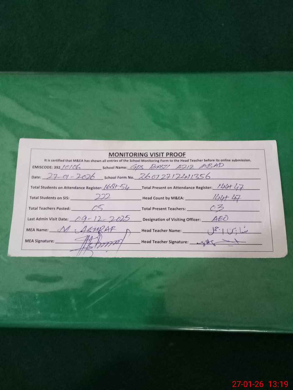 | EMIS Code: 39210106 | Name of School: GPS AZIZ ABAD BASTI SWL.ROAD PAKPATTAN | |||