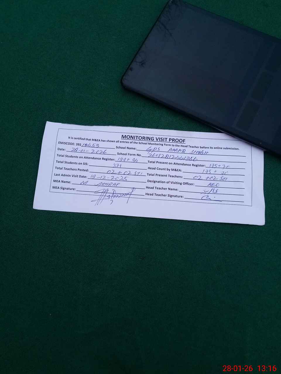 | EMIS Code: 39210453 | Name of School: GPS AMAR SINGH P/O 26/S.P PAKPATTAN | |||