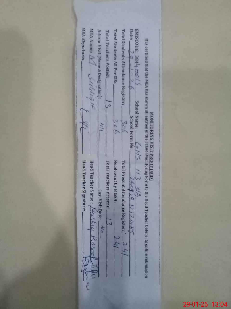 | Attendance Register | Head Teacher | MEA with School | Visit Proof |