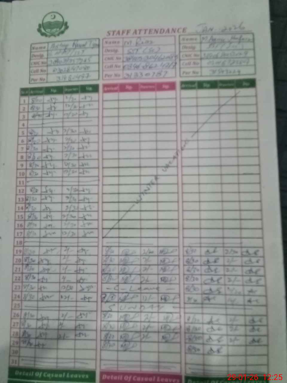 | CNIC | Full Name | Designation | R/C | Absence During Last Calender Month |