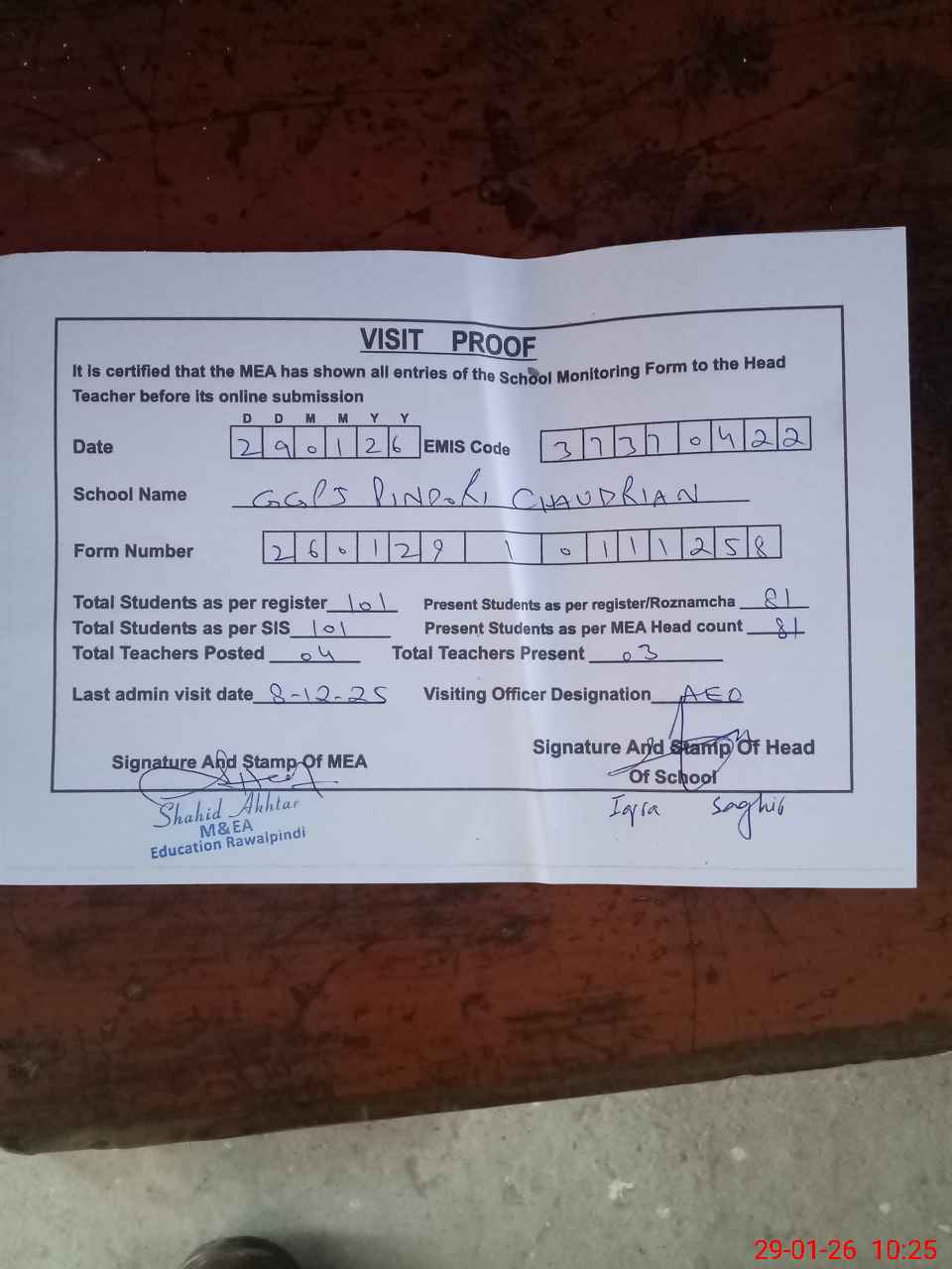 | Attendance Register | Head Teacher | MEA with School | Visit Proof |