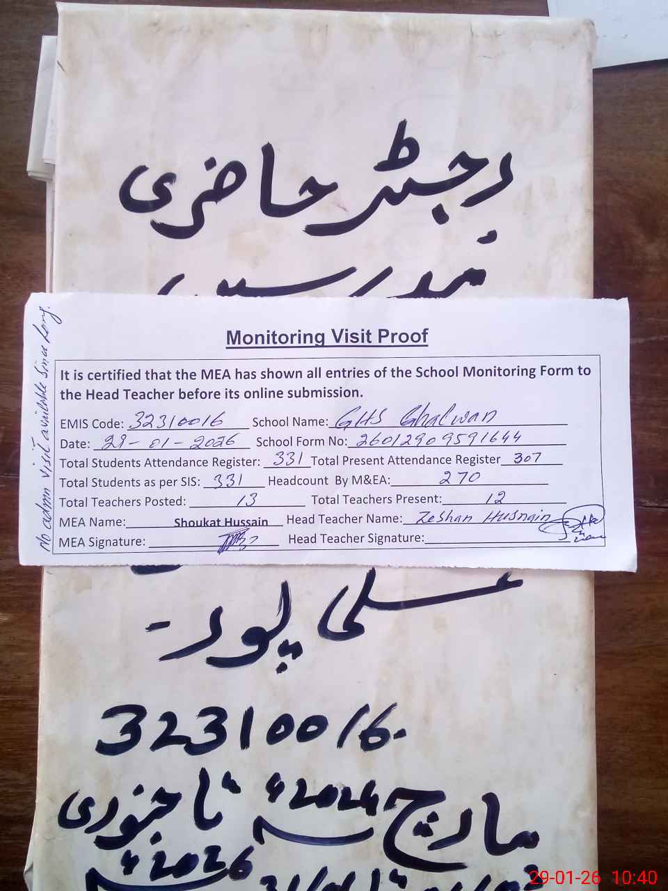 | Attendance Register | Head Teacher | MEA with School | Visit Proof |