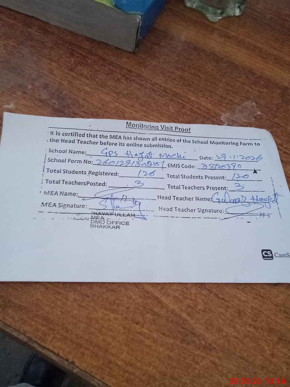 | Attendance Register | Head Teacher | MEA with School | Visit Proof |
