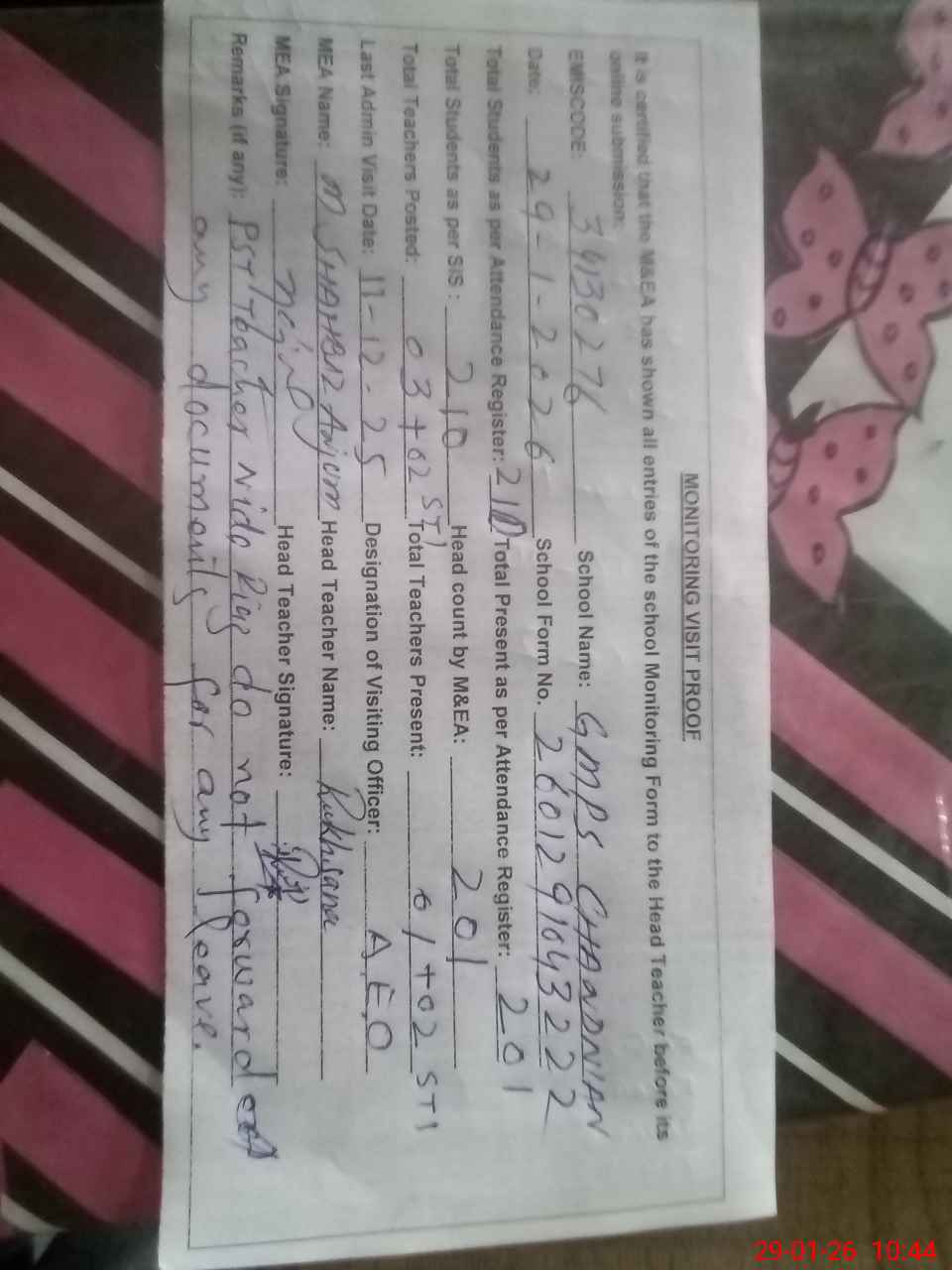 | Attendance Register | Head Teacher | MEA with School | Visit Proof |