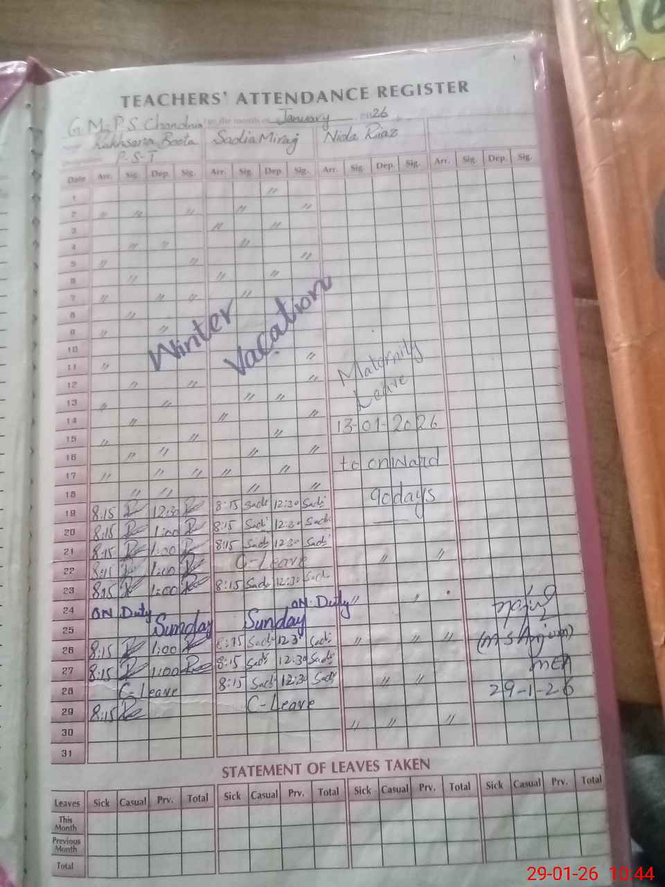 | Leave | Duty | Absent | Maternity | Medical | Ex- Pak |