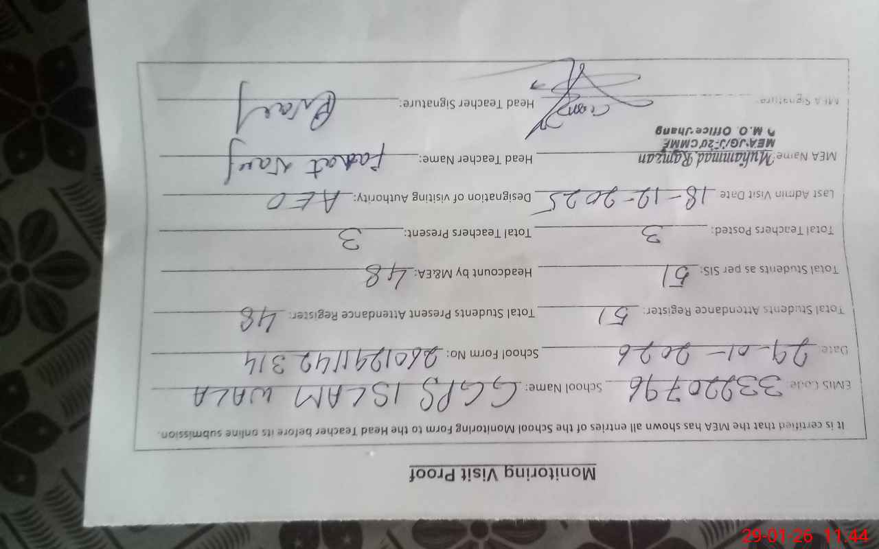 | Attendance Register | Head Teacher | MEA with School | Visit Proof |