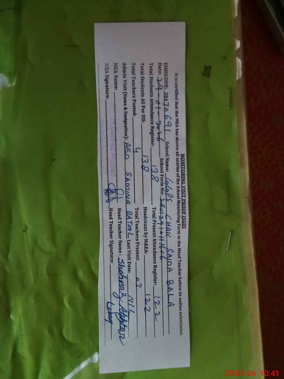 | Attendance Register | Head Teacher | MEA with School | Visit Proof |