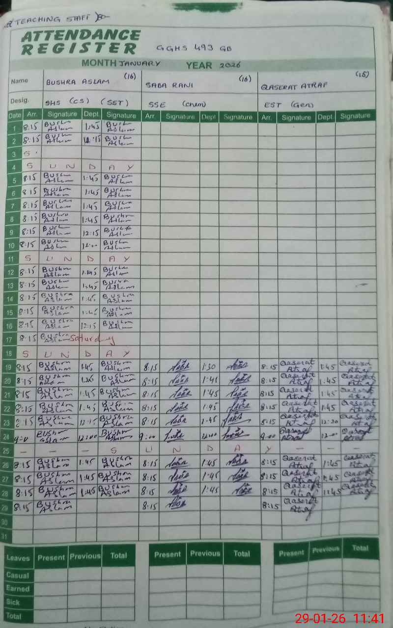 | CNIC | Full Name | Designation | R/C | Absence During Last Calender Month |