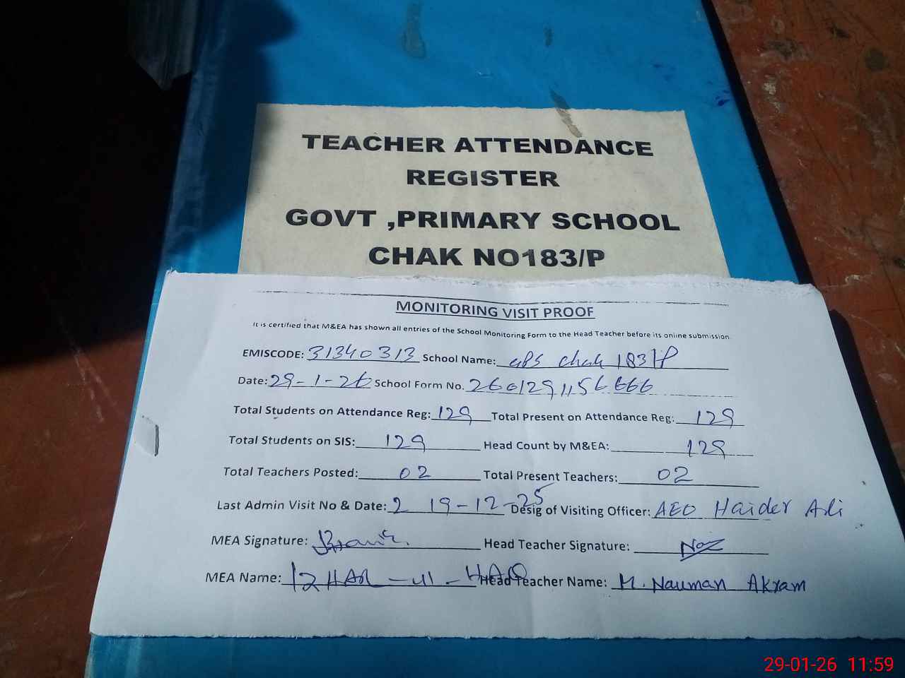 | Attendance Register | Head Teacher | MEA with School | Visit Proof |