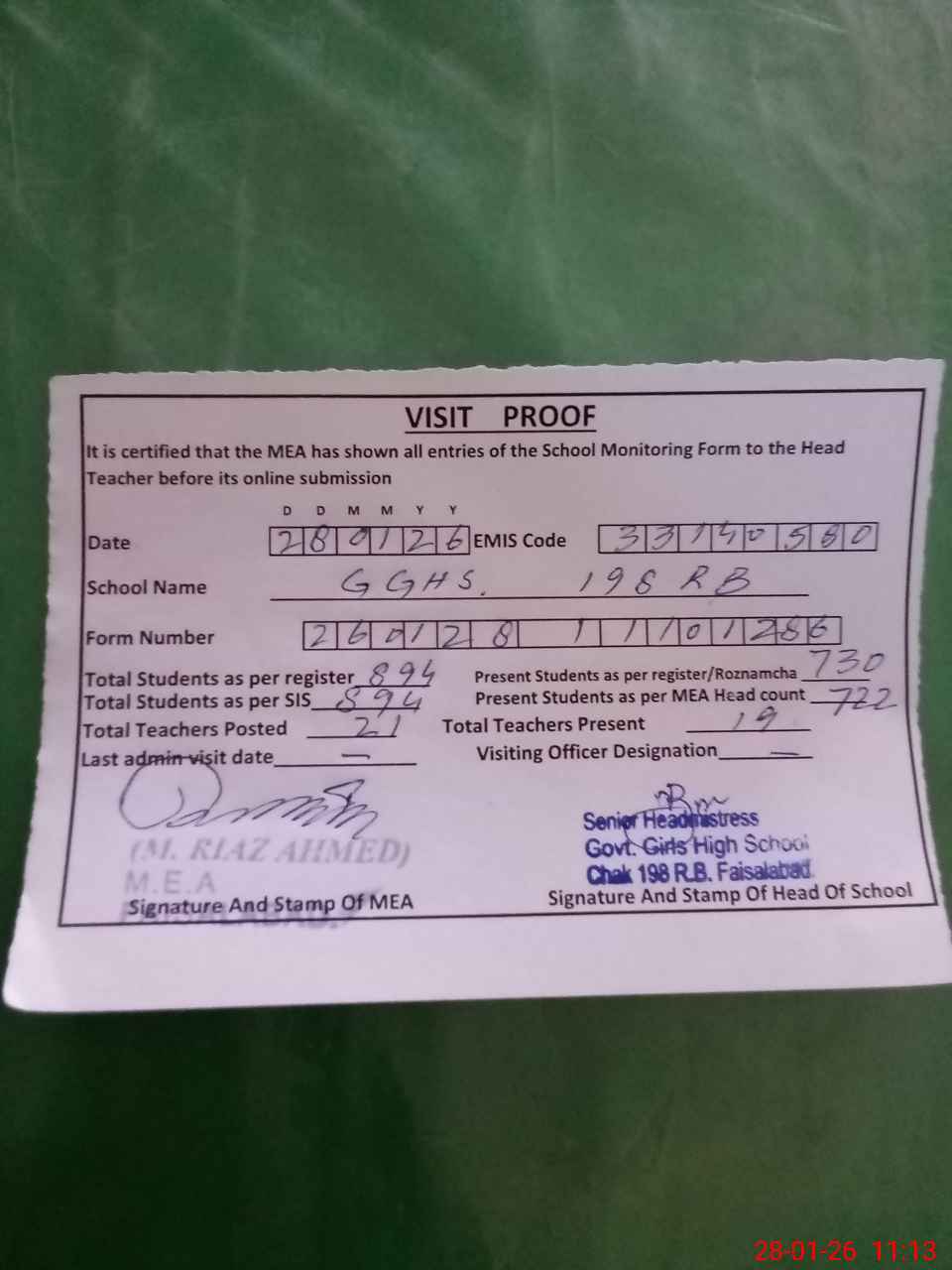 | Attendance Register | Head Teacher | MEA with School | Visit Proof |
