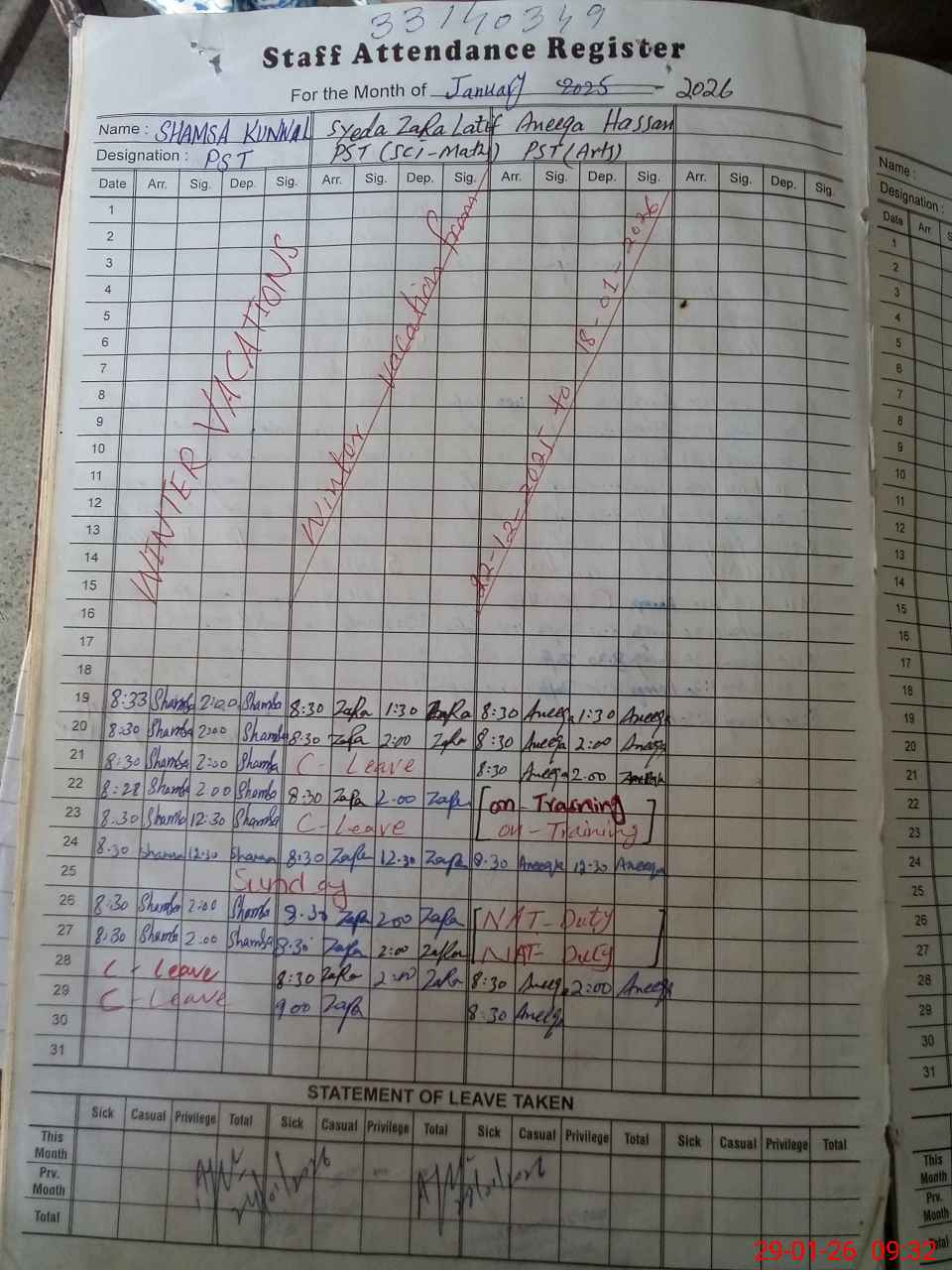 | 33**** | Sy**** Za**** La**** | PST Science/Maths | Regular | 0 | 0 | 0 | 0 | 0 | 0 | 0 | 0 | 0 | Present (Latecomer) |