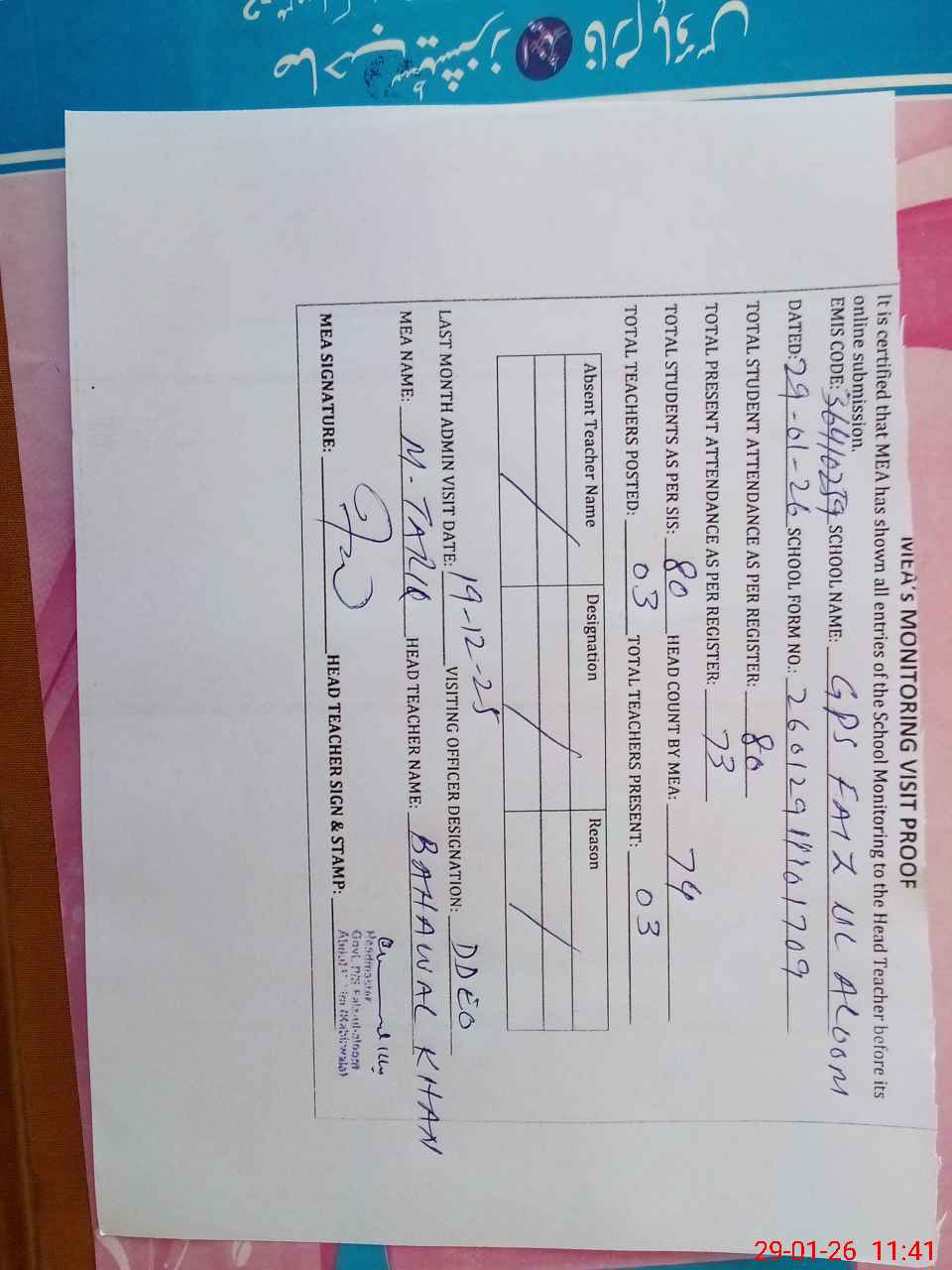 | Attendance Register | Head Teacher | MEA with School | Visit Proof |