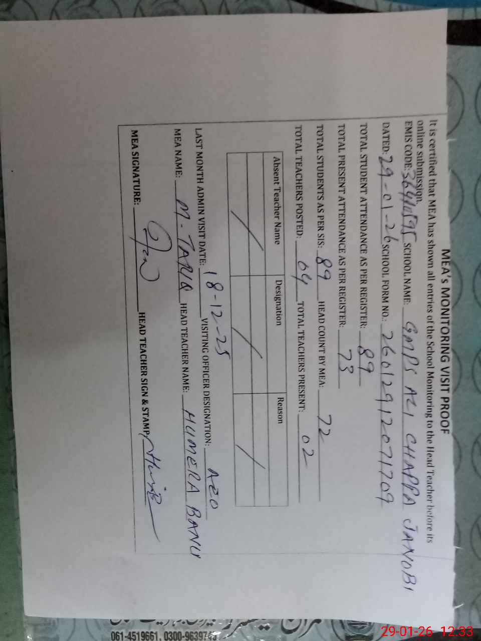 | Attendance Register | Head Teacher | MEA with School | Visit Proof |