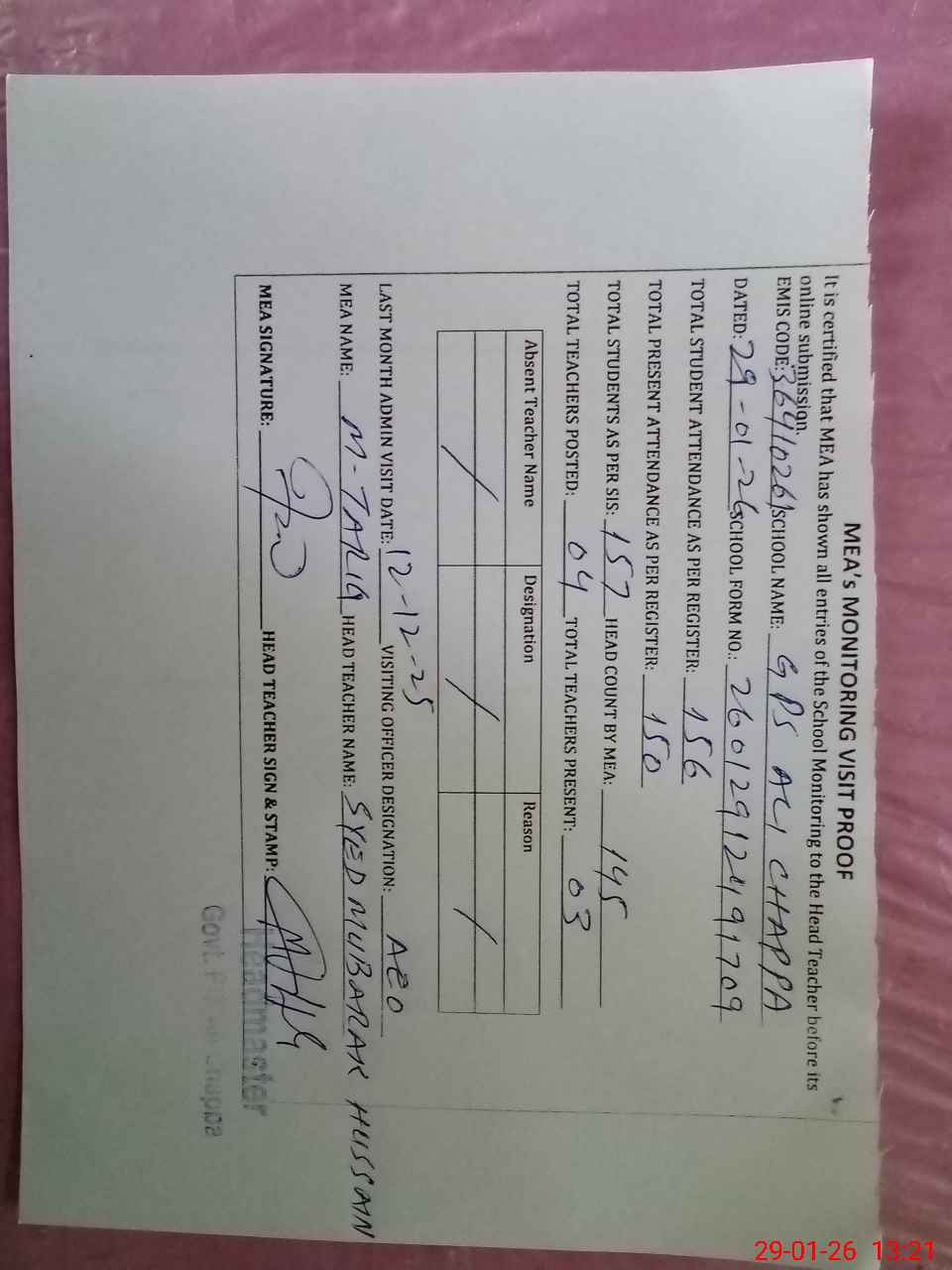| Attendance Register | Head Teacher | MEA with School | Visit Proof |