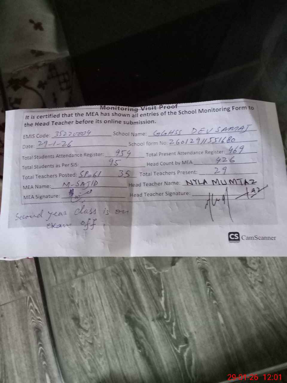 | Remarks (Use Separate Page if Required): Second year class is on exam off So 43 students difference found in Roznamcha and head count 35220004 | |||||