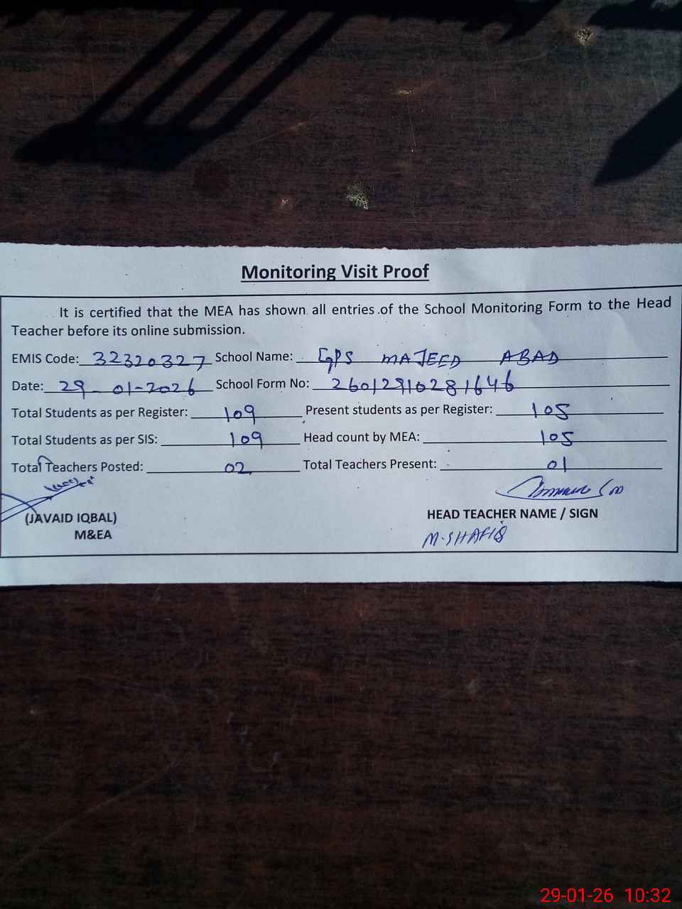| EMIS Code: 32320327 | Name of School: GPS MAJEED ABAD | |||