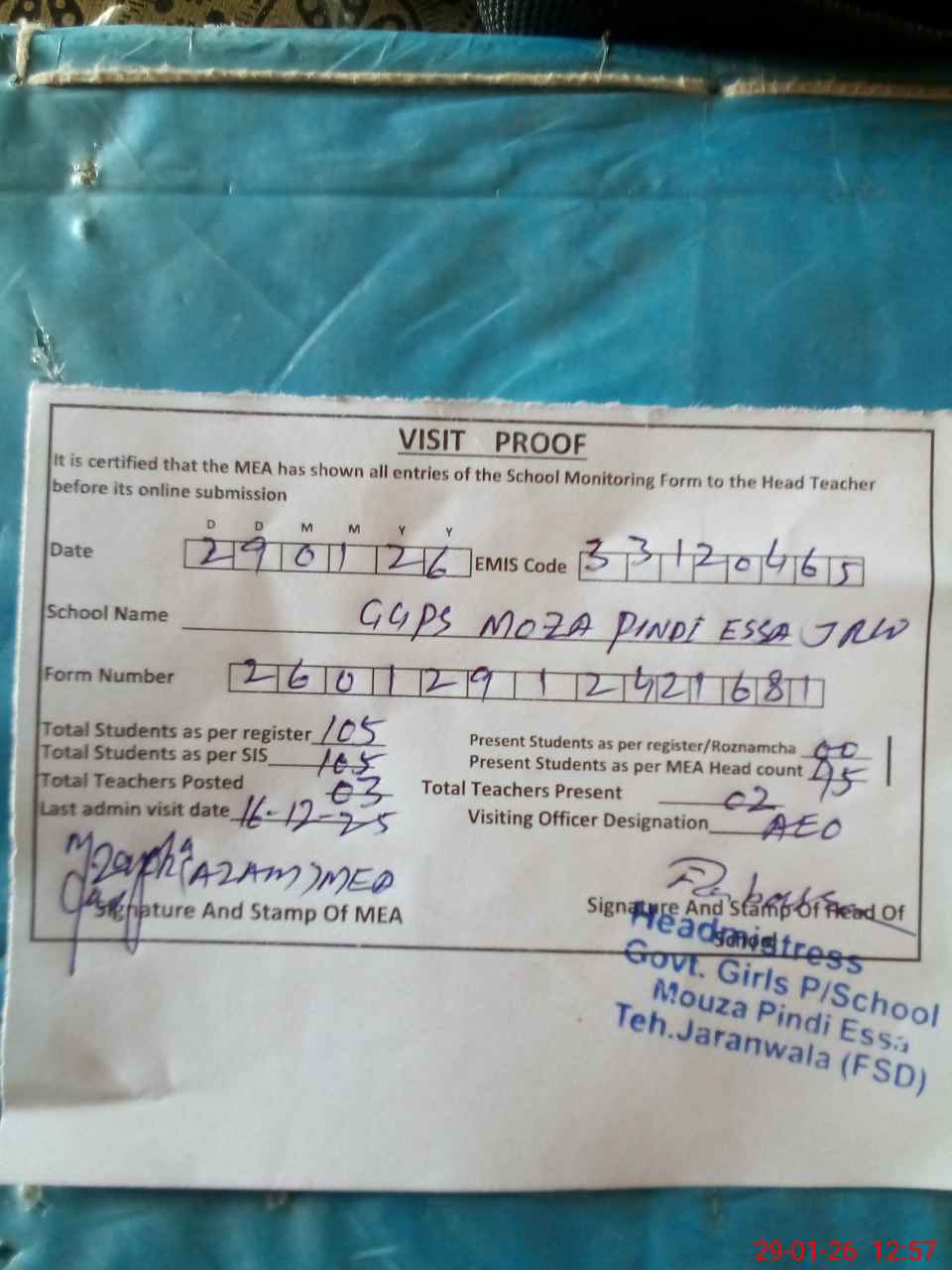 | Attendance Register | Head Teacher | MEA with School | Visit Proof |