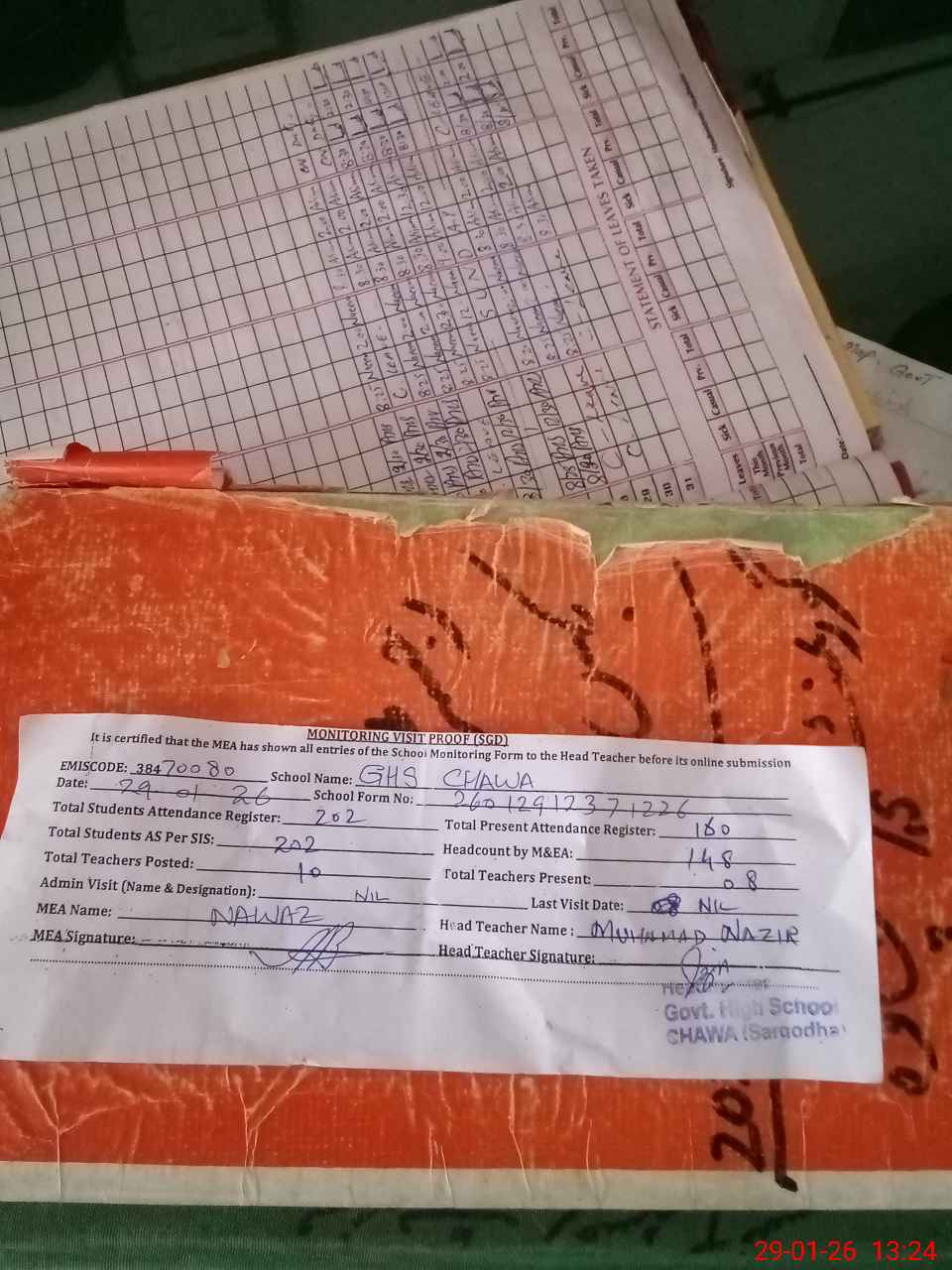 | Attendance Register | Head Teacher | MEA with School | Visit Proof |