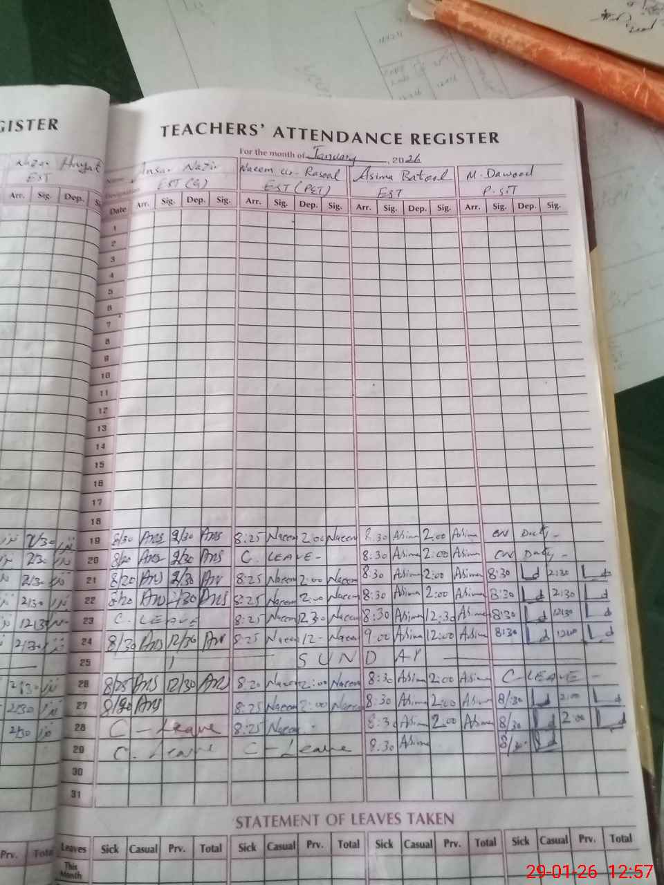 | Leave | Duty | Absent | Maternity | Medical | Ex- Pak |