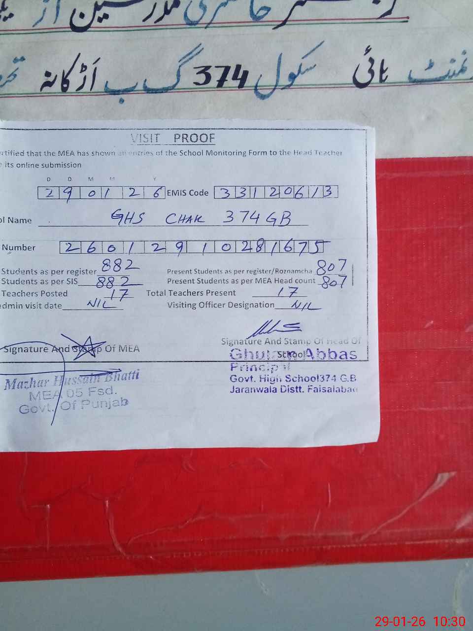 | EMIS Code: 33120613 | Name of School: GHS CHAK 374 GB | |||