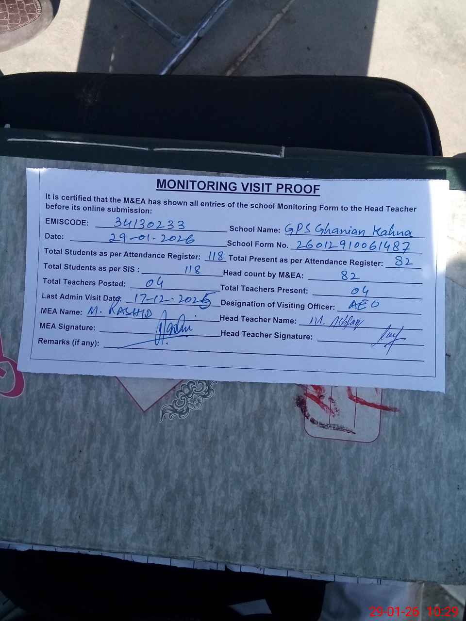 | Attendance Register | Head Teacher | MEA with School | Visit Proof |