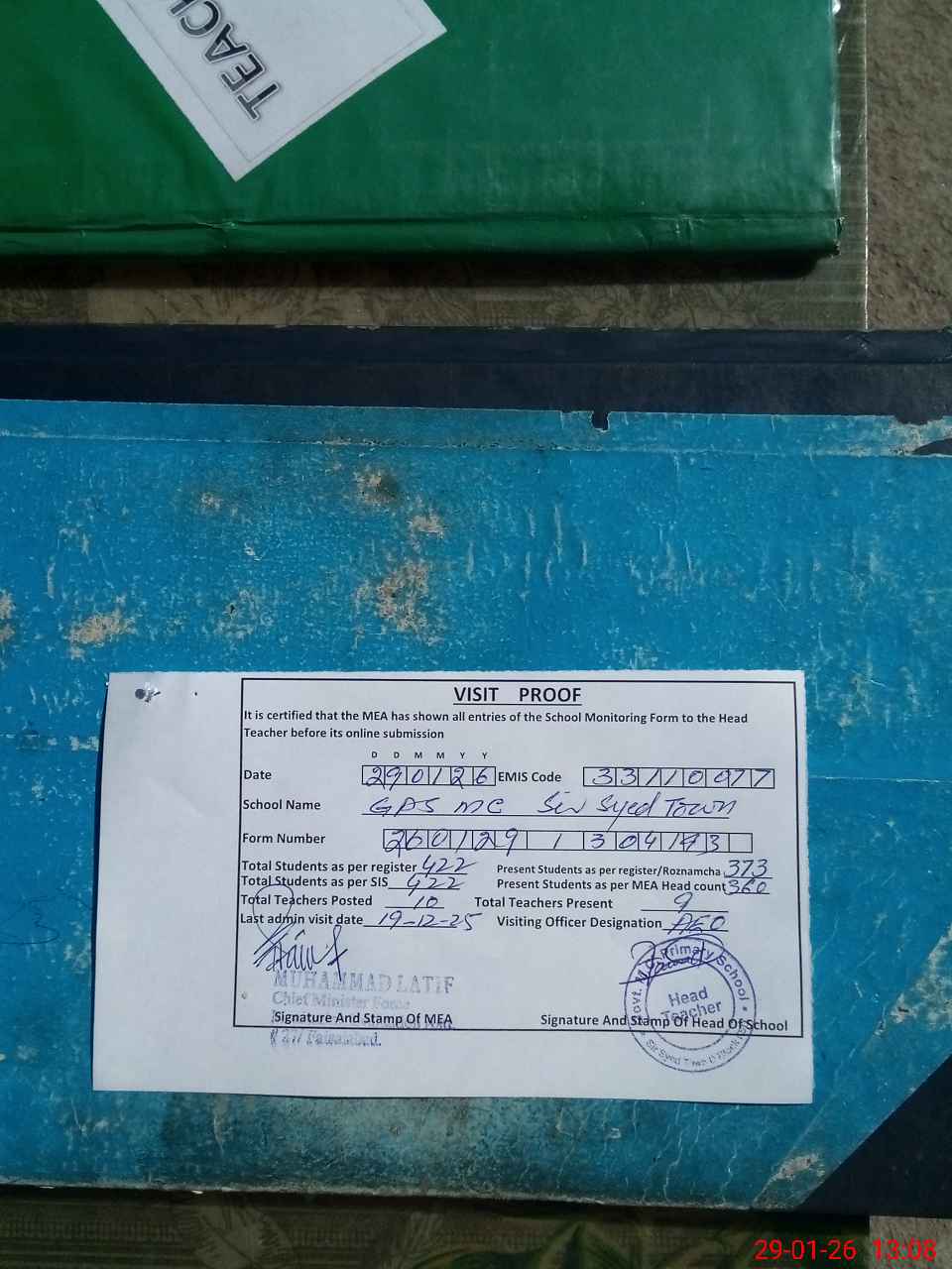 | Attendance Register | Head Teacher | MEA with School | Visit Proof |