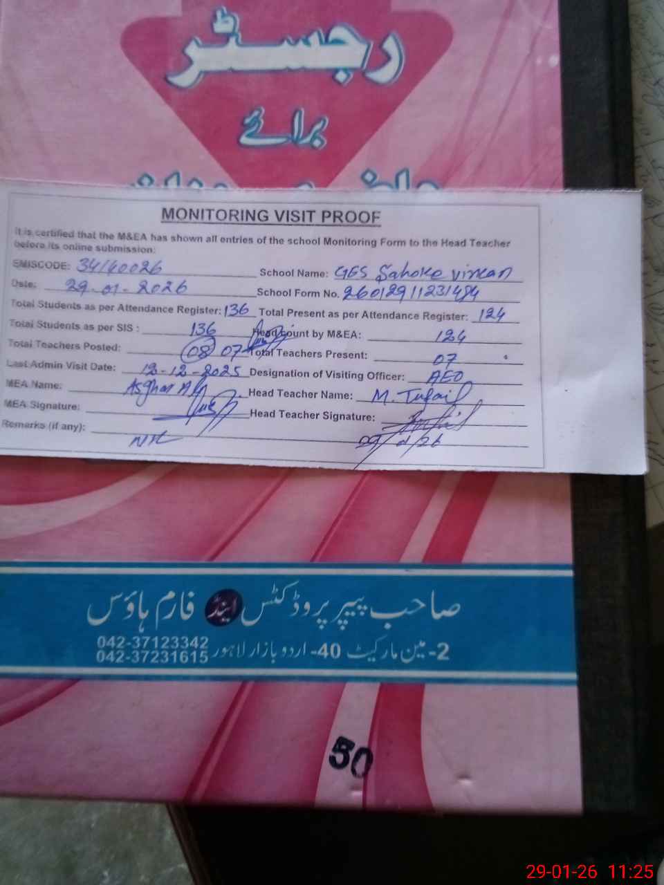 | Attendance Register | Head Teacher | MEA with School | Visit Proof |