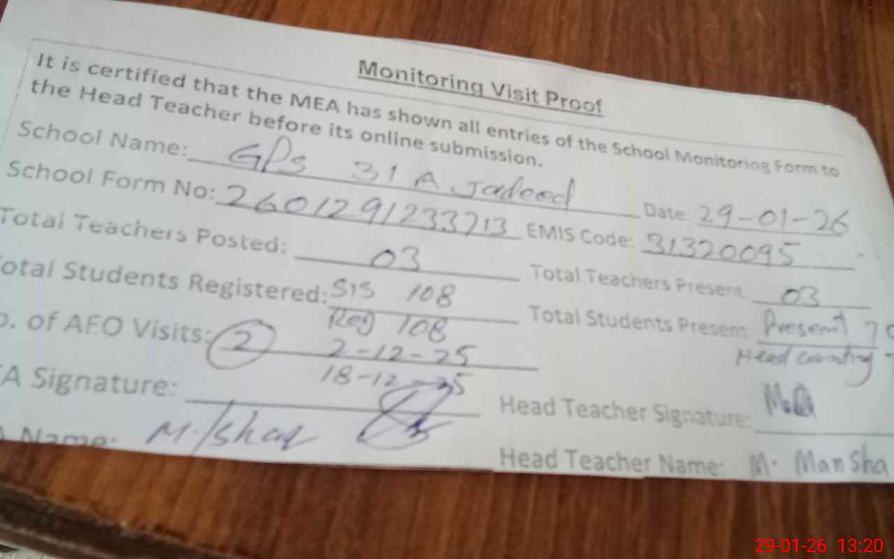 | EMIS Code: 31320095 | Name of School: GPS PAKKI MANDI 31/A JADEED | |||