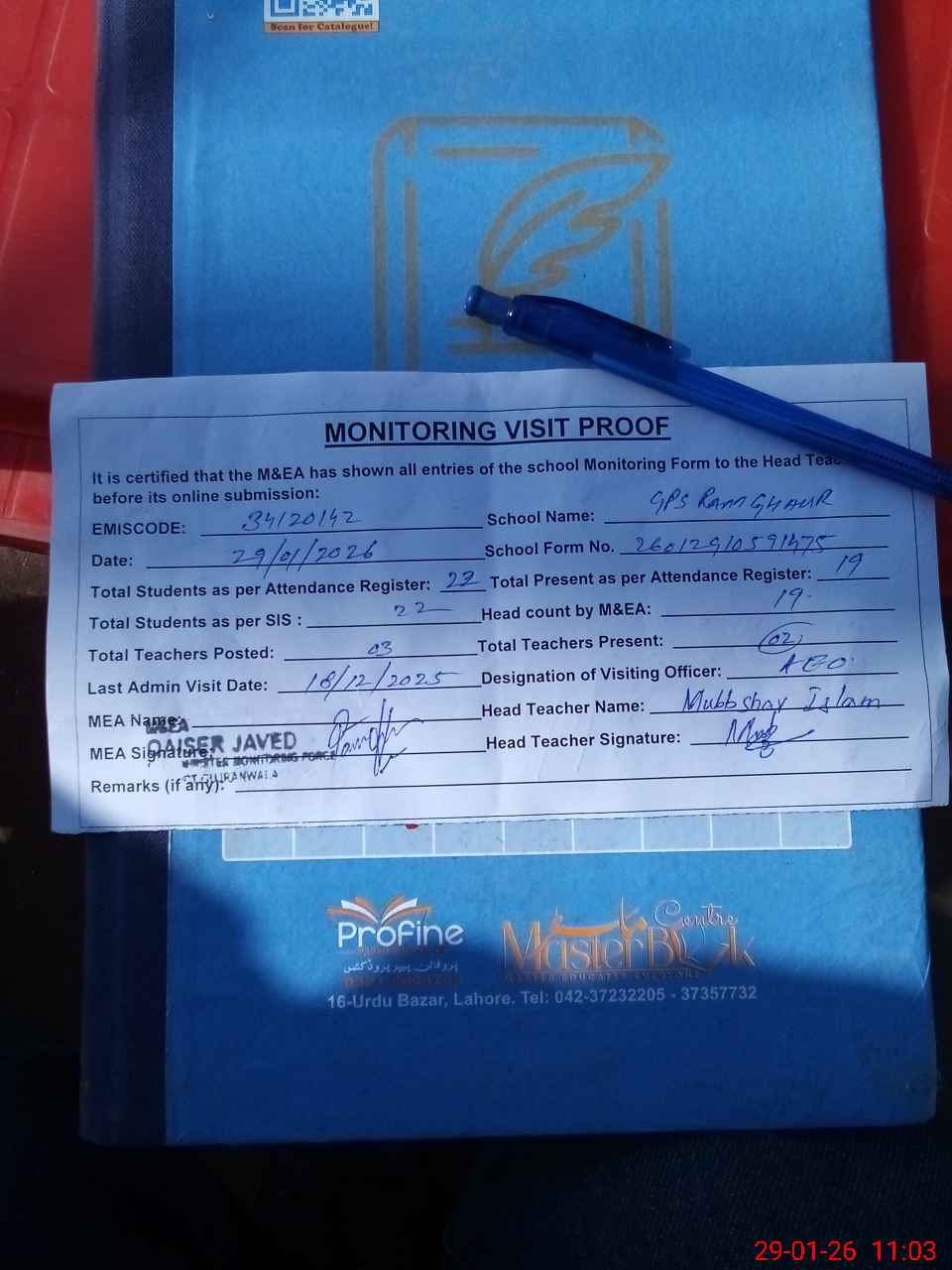 | Attendance Register | Head Teacher | MEA with School | Visit Proof |