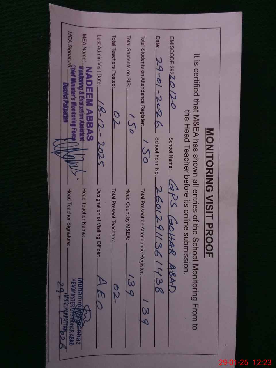 | Attendance Register | Head Teacher | MEA with School | Visit Proof |
