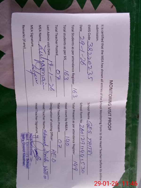 | Remarks (Use Separate Page if Required): Total student as per SIS 163 Total student as per Register 163 Total present as per Register 149 Head count by MEA 140 Boundary wall under construction | |||||