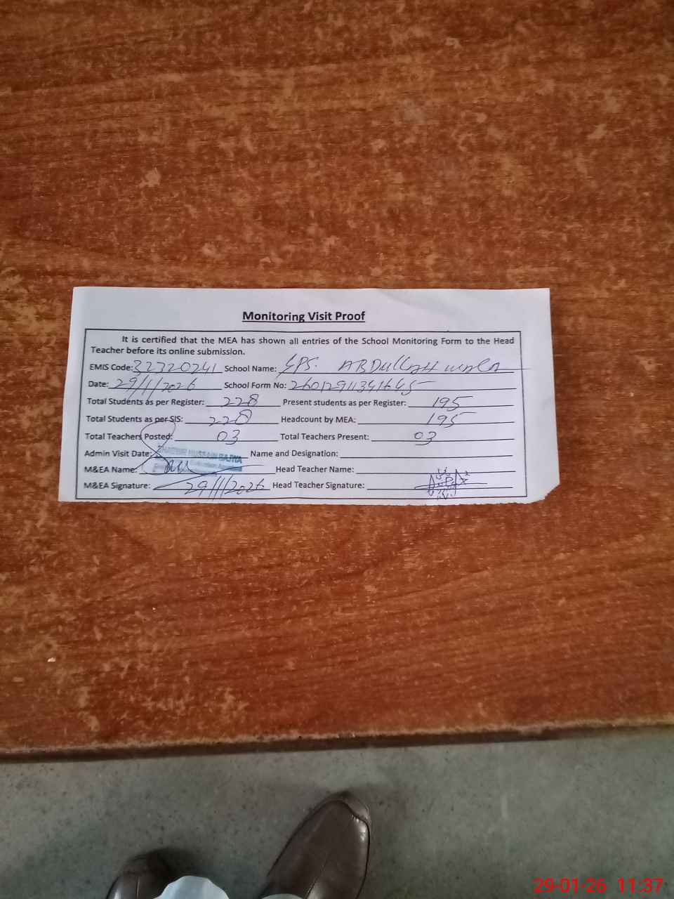 | Attendance Register | Head Teacher | MEA with School | Visit Proof |