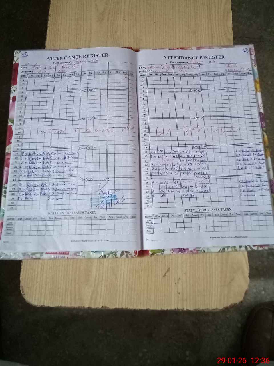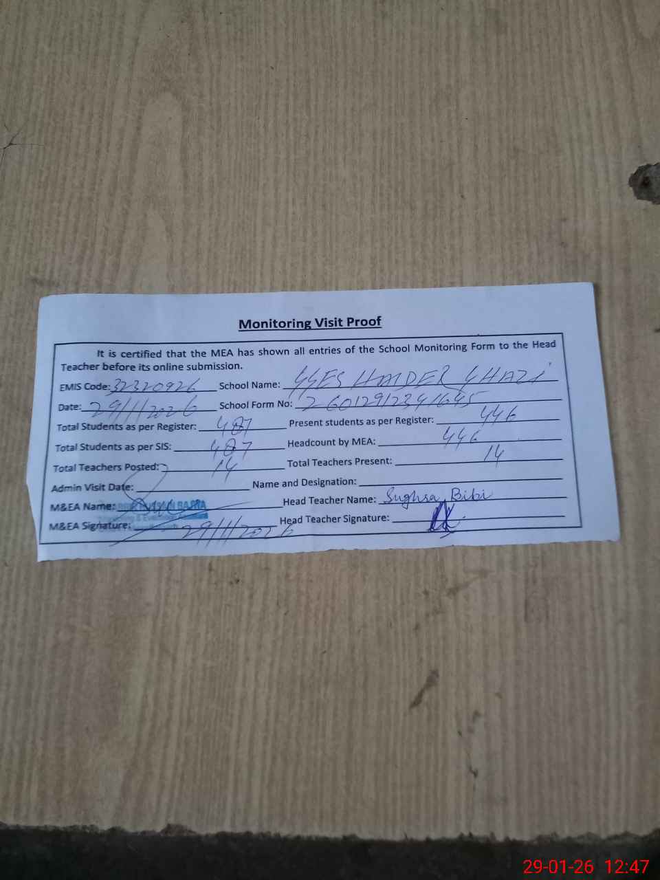 | Attendance Register | Head Teacher | MEA with School | Visit Proof |