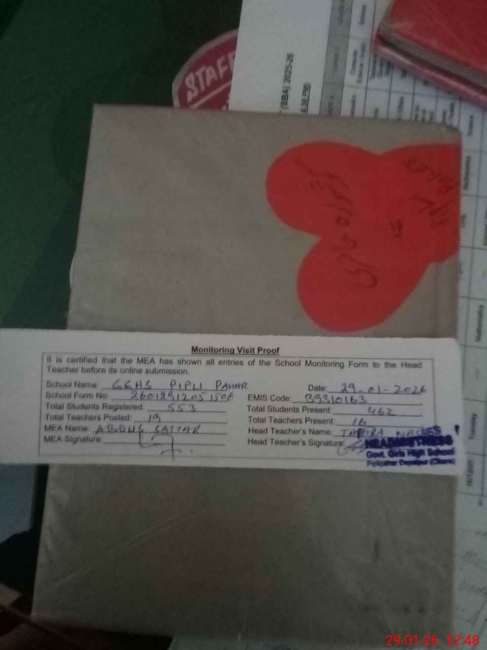 | Attendance Register | Head Teacher | MEA with School | Visit Proof |
