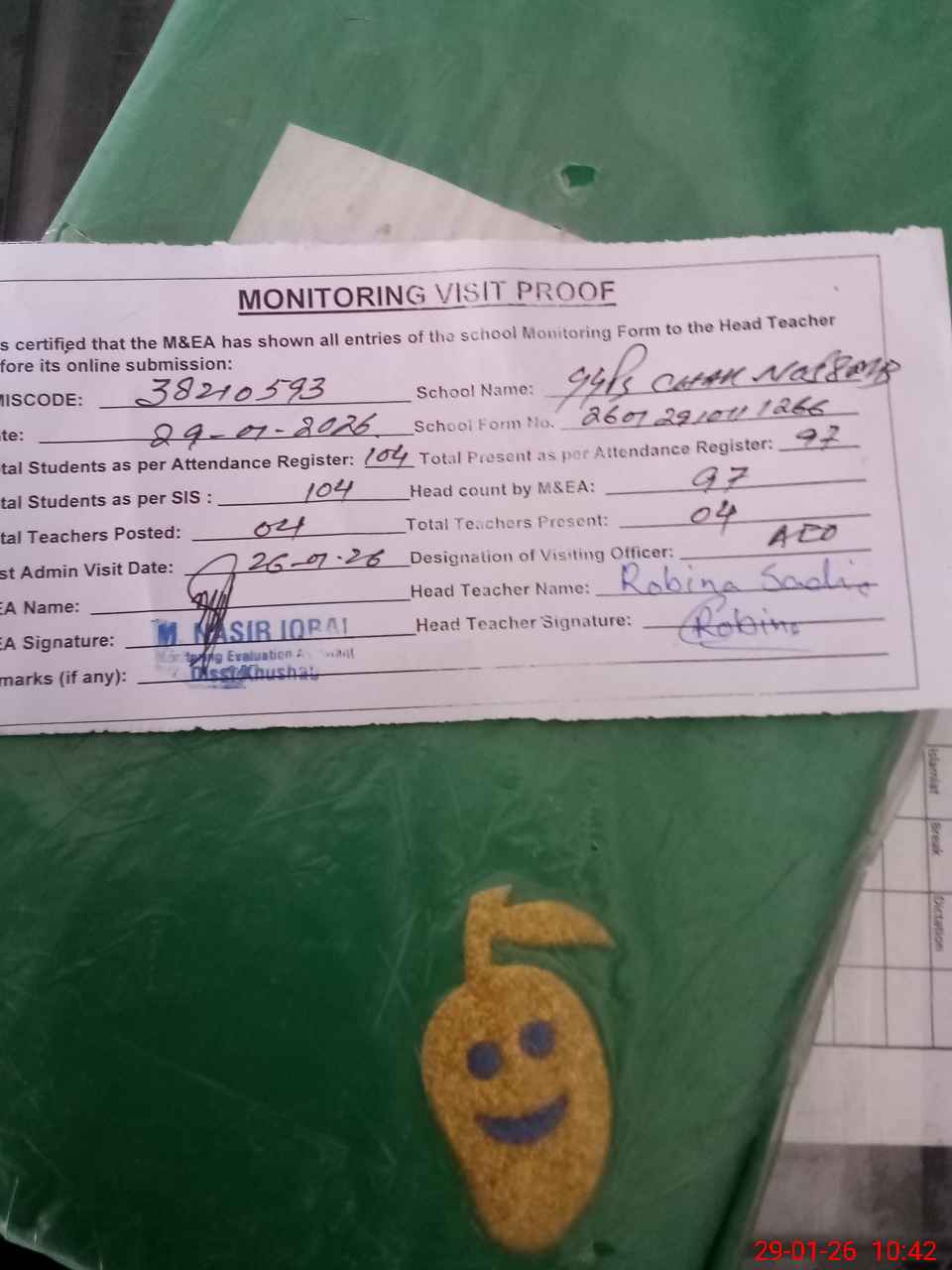 | Attendance Register | Head Teacher | MEA with School | Visit Proof |