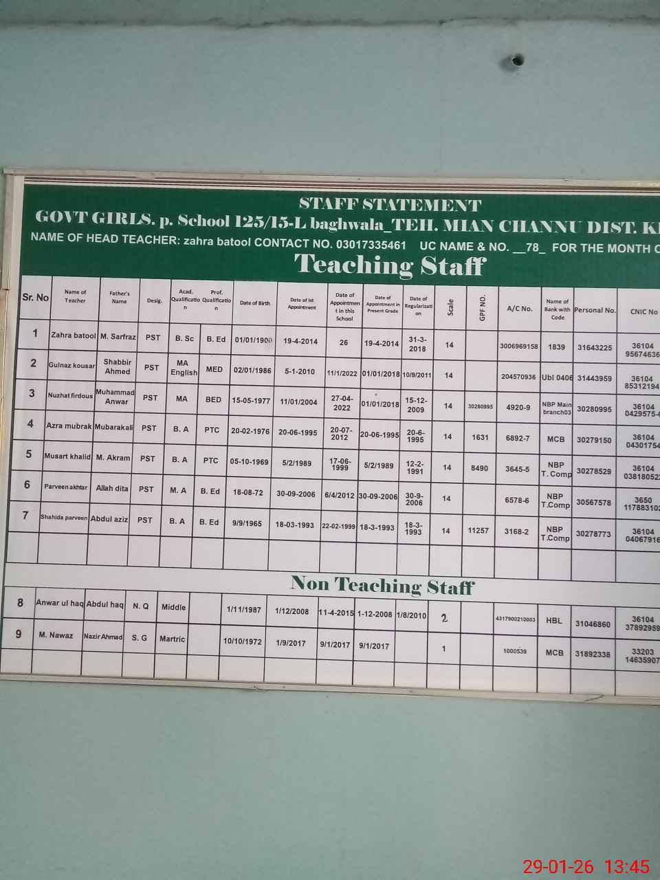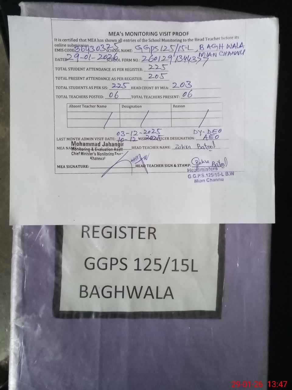 | EMIS Code: 36430325 | Name of School: GGPS 125/15-L BAGH WALA, MIAN CHANNU | |||