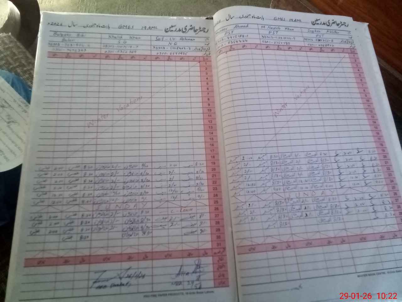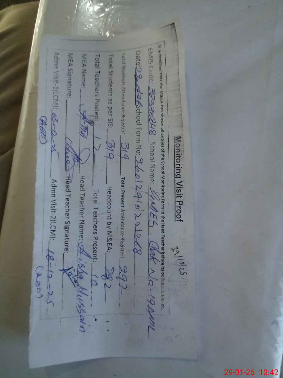 | Total no. of Classrooms: 12 No. of Classrooms Used for Teaching: 11 No. of Classrooms Storing Old Furniture, FTBs, etc: 0Comments if Any: Teacher Ghazala Yasmeen PST Nic no 38301 08529678 is absent on dated 01 January 2026 to update Books complete but D3 nil Boundary not functional due to wall not available about length 252 feet |