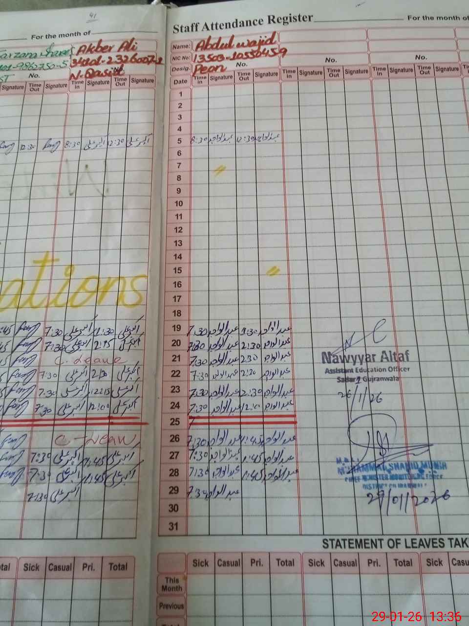 | CNIC | Full Name | Designation | R/C | Absence During Last Calender Month |