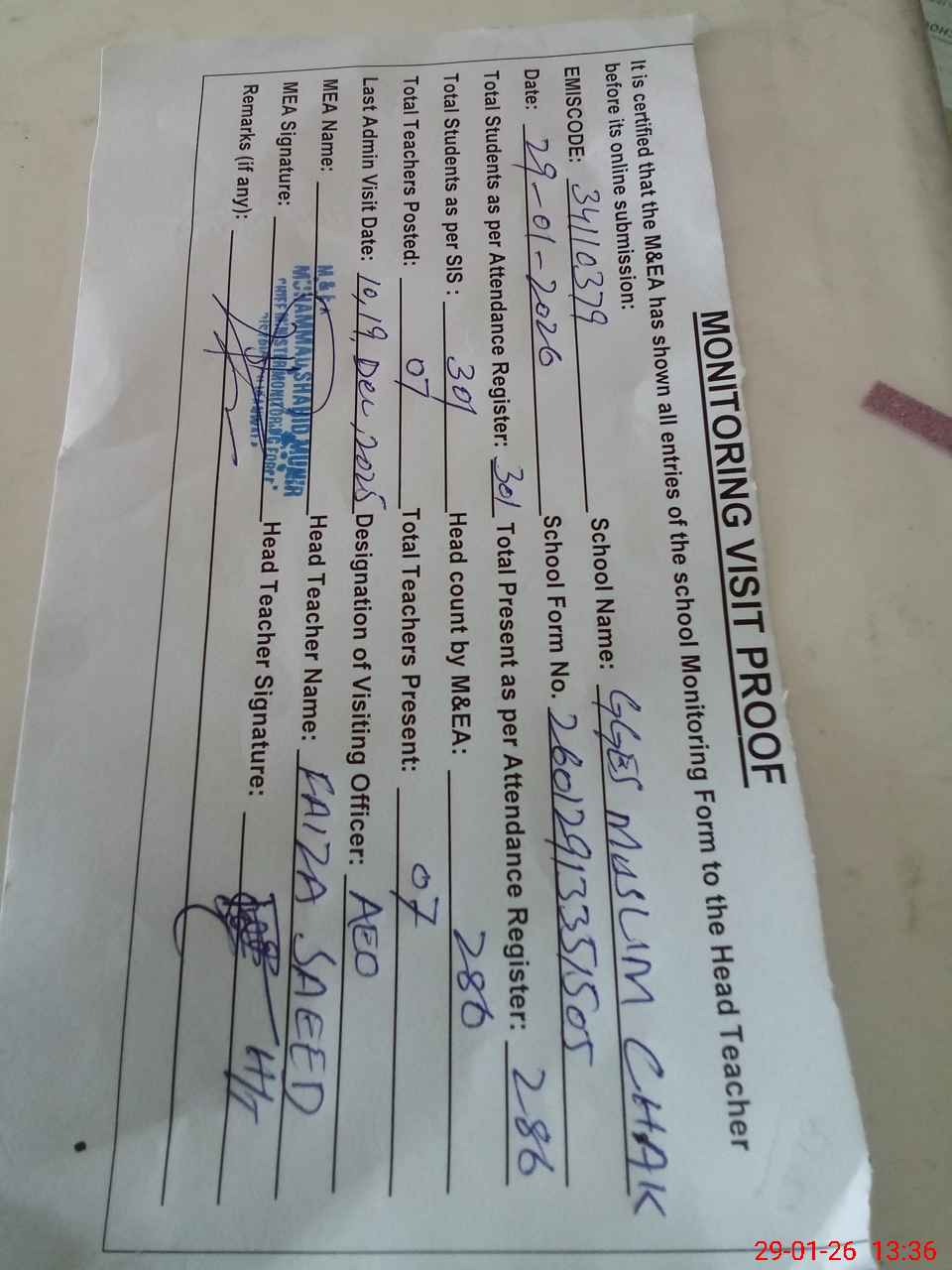 | Attendance Register | Head Teacher | MEA with School | Visit Proof |