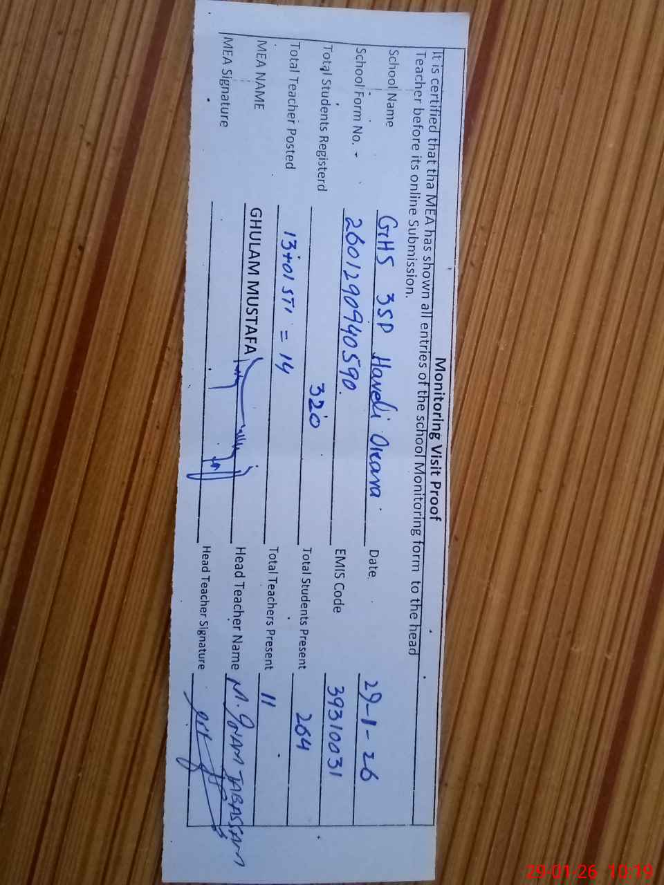| Attendance Register | Head Teacher | MEA with School | Visit Proof |