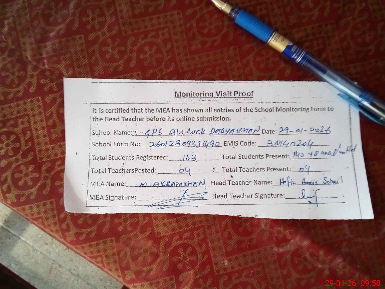 | Attendance Register | Head Teacher | MEA with School | Visit Proof |
