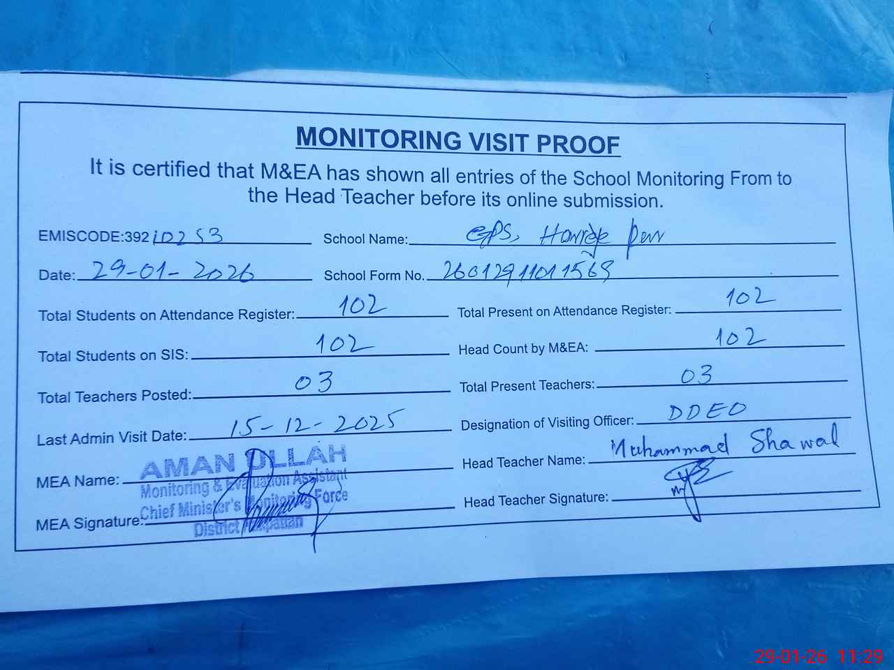 | Attendance Register | Head Teacher | MEA with School | Visit Proof |