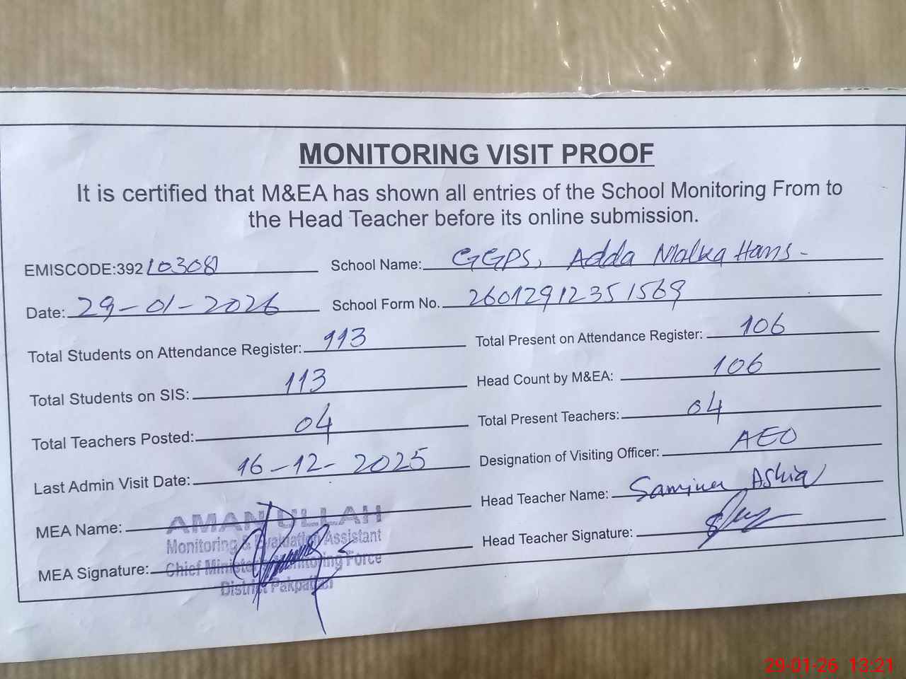 | Attendance Register | Head Teacher | MEA with School | Visit Proof |